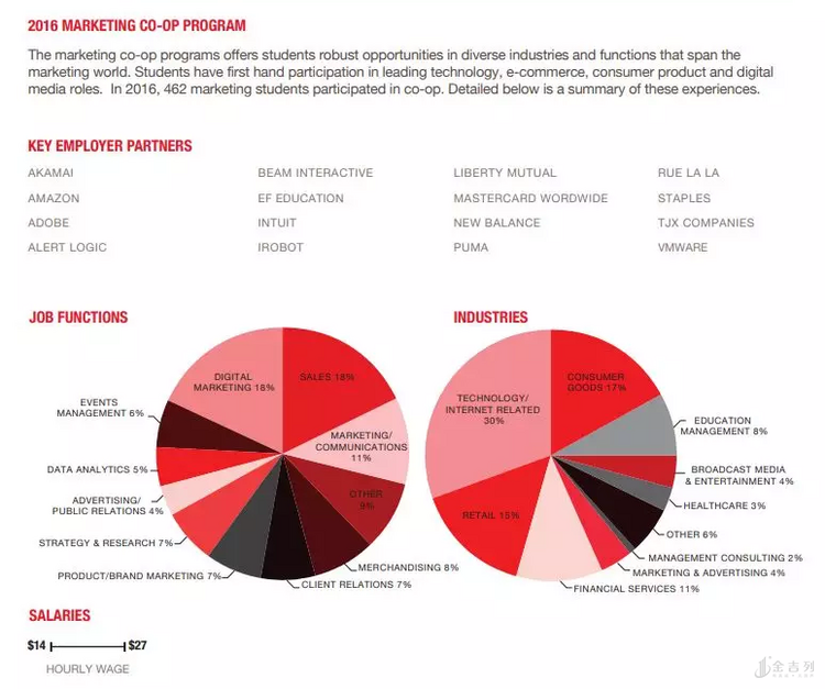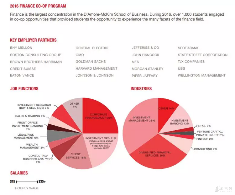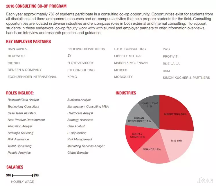 同学们可以看一下来自东北大学官网的分析报告, 2016 年金融、市场、咨询等行业的具体数据,每一项的时薪都不低,且工作职能多元化,就业公司也很乐观。