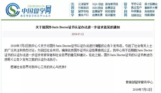 为回应社会关切,确保此类国外证书认证结果客观公正,我中心将于近期就Juris Doctor证书的认证办法进一步征求专家学者和社会各界的意见和建议。在此之前,国外Juris Doctor证书的认证书表述仍按照《公告》发布之前的认证办法执行。