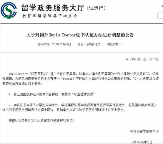 7月12日,教育部留学服务中心针对7月2日公示的JD学位认证新办法进行叫停。本月初教育部留学服务中心发布了对于美国和澳洲JD学位认证的调整公告,将美国和澳大利亚JD证书的学历层次明确表述为硕士层次,将加拿大JD证书的学历层次明确表述为学士层次,这一调整引起了很大争议。
