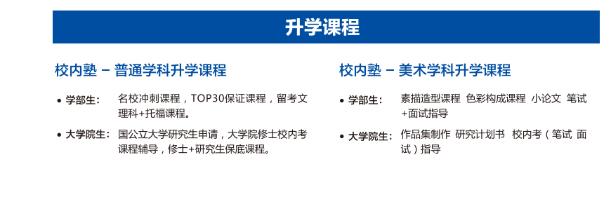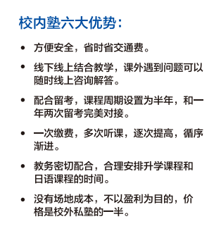 校内设置私塾部门,有独立的私塾办公室及升学咨询室,任何学生都可以在有问题时随时去咨询。因为是学校内部的塾,所以授课地点也是学校,可以为学生节省交通费和时间。并且教务老师可以第一时间了解学生的学习态度和升学准备的进度,信息可以及时互通,还可以避免在外读塾产生问题和矛盾无法解决的事情发生。