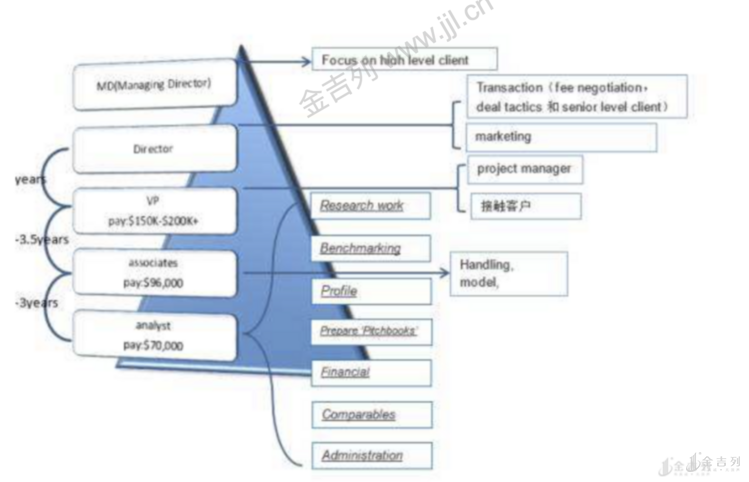 主要工作内容可以包括:Presentation、Analysis、Aministrative Work等。“ASSOCIATE”这个岗位是比ANALYST高一级的职位,需要从ANALYST晋升而来,或者是公司从各名校招入的MBA学生。一般在ASSOCIATE岗位做三年左右才有机会晋升为VP。