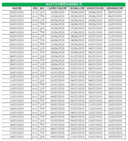 2019年7月到10月雅思考试机考报名截止日期、准考证打印日期和成绩单寄送日期