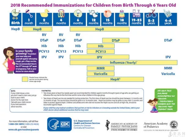 首先我们来看看美国 CDC 官方推荐的 0-6 岁疫苗接种程序,有兴趣的朋友可以戳 CDC 官网( https://www.cc.gov/vaccines/scheules/ )了解各个年龄段应该接种的疫苗。