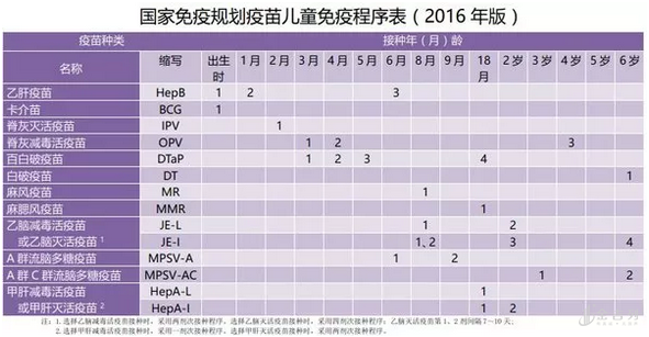 而中国 0-6 岁儿童必须要打的第一类疫苗则有以下这些,以下是国家卫生计生委疾病预防控制局 2016 年年底公布的儿童免疫程序表