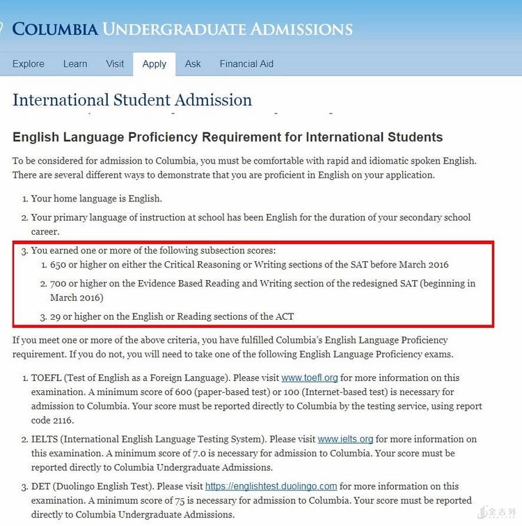 例如,在哥伦比亚大学,如果 SAT 的阅读和写作得分在 700 分以上、 ACT 的英语阅读在 29 以上的国际生,不需要提交语言成绩。