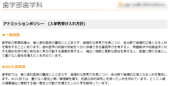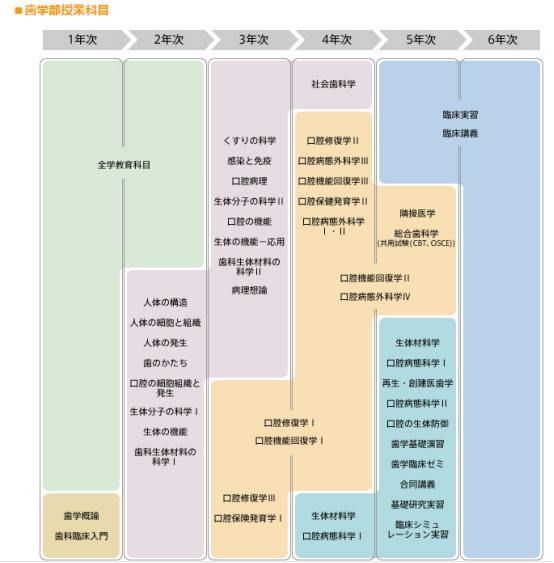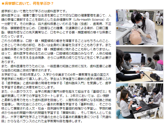牙科医疗的人,作为研究人员的基本素质,即丰富的教养和人性,具备较高的伦理价值观,带着“心”科学知识探索,并得到高度作为专门职业人的牙科医生,教育研究人员培养为目标,培养基础牙医学和临床牙医学的统合希求的“临学一体”的基本理念。牙科专业根据这些目标、理念,以以下方针实施教学课程。入学后的第一年会支持学习牙学欲望的动机(early motivation)和牙科医疗现场的早期体验(early exposure)。
