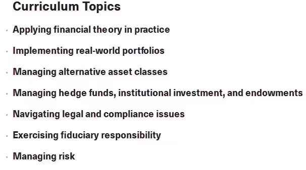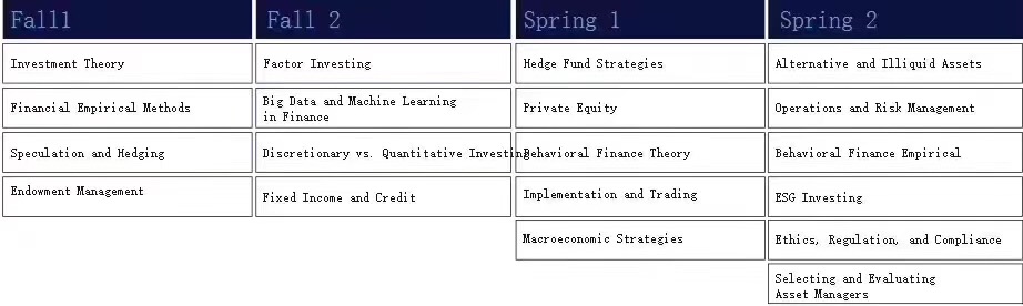 该专业针对刚获得本科学历或工作经验不到三年的申请者,培养未来金融行业资产管理者的投资分析能力,因此,申请者需具备较强的数量背景,包括至少一门高级统计或概率数学课程。计算机编程、微积分以外的高等数学或者经验。