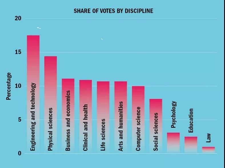 代表人数最多的领域是工程与技术(占17.5%),其次是自然科学(占14.4%),其余领域依次为商科和经济(11.1%),临床与健康(占10.9%),生命科学(占10.7%),艺术及人(10.7%),计算机科学(10%),社会科学(8.1%),心理学(3.1),教育学(2.5),法律(1%)。
