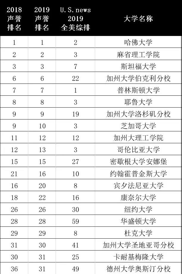 与2018年世界大学声誉排行榜相比,美国的前七名学校排名没有变化,芝加哥大学、哥伦比亚大学、加州理工学院、约翰霍普金斯大学、康奈尔大学、卡耐基梅隆大学的排名稍微下滑,但幅度较小。