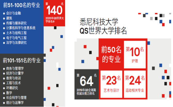 在QS校龄低于50的世界大学前50名排名中,UTS排名澳洲第一,全球第十名,展现了其在研究、教学、就业能力以及国际化领域的实力。