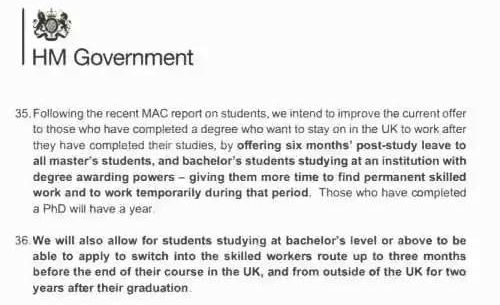 “我们特别欢迎改善签证制度的措施,包括将我们的毕业生毕业后在英国工作的机会延长至6个月,本科生和研究生延长至6个月,博士生延长至1年。”