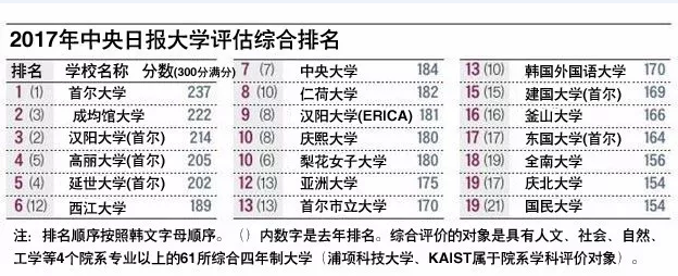 首尔大学在“ 2017 年中央日报大学评估”综合评估中排名第一。其后依次是 成均馆大学、汉阳大学(首尔)、高丽大学(首尔)和延世大学(首尔)、西江大学。