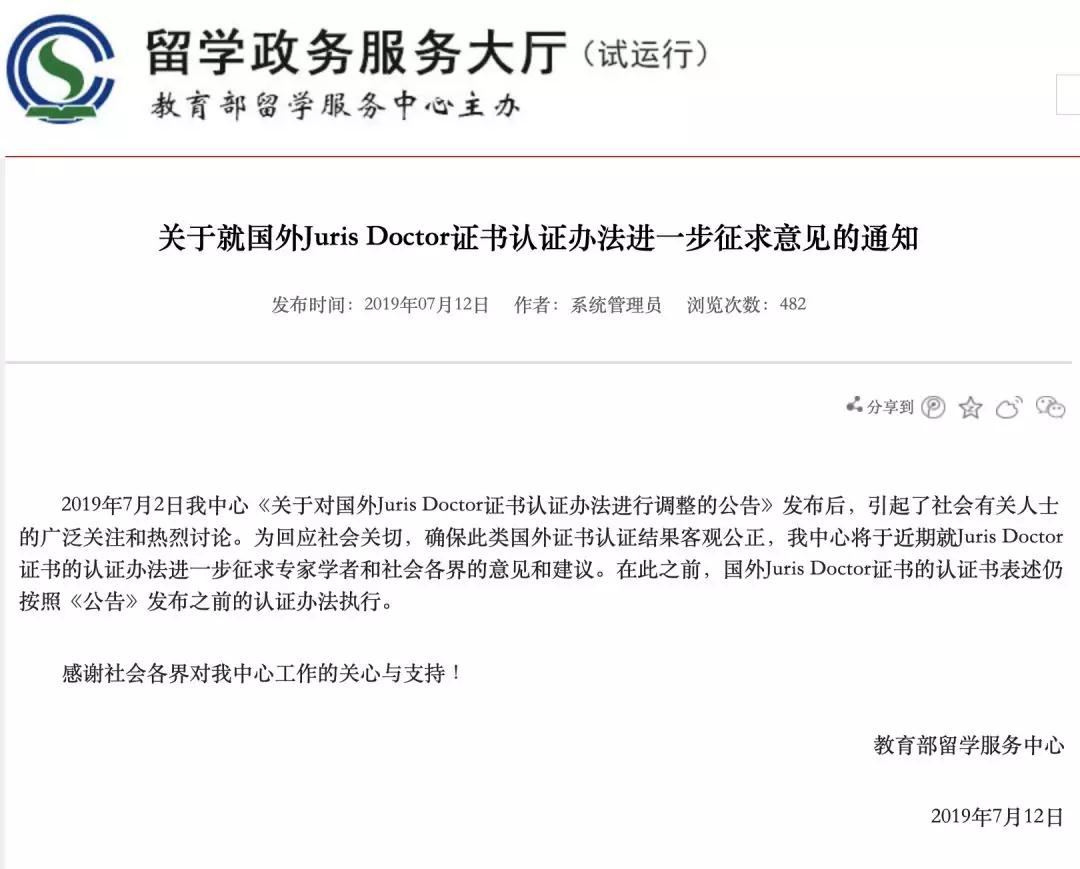 为回应社会关切,确保此类国外证书认证结果客观公正,我中心将于近期就Juris Doctor证书的认证办法进一步征求专家学者和社会各界的意见和建议。 在此之前,国外Juris Doctor证书的认证书表述仍按照《公告》发布之前的认证办法执行 。
