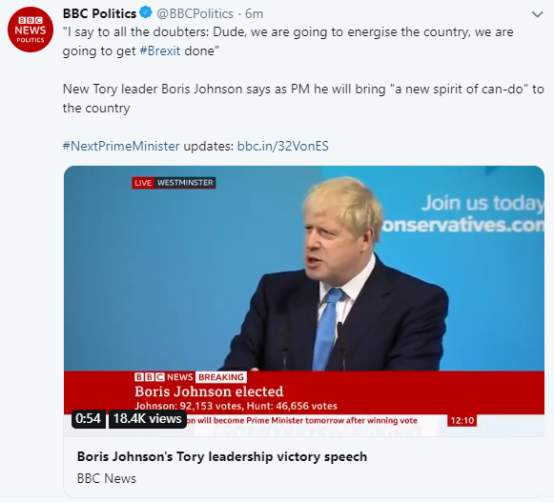 而当选后的鲍里斯说到,能够在特蕾莎·梅的内阁任职是一种荣幸。感谢她为国家做出的贡献。并表示被选为保守党领袖是一种“非凡的荣誉和特权”。并向在保守党领袖竞选中击败对手杰里米·亨特致敬。