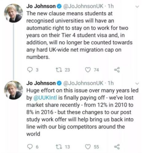 随后,Jo Johnson还在自己的推特下留言补充道:新条款意味着受到认可大学的海外学生在毕业后可以享有2年在英国找工作的时间。