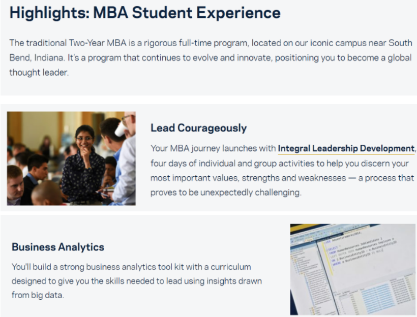 在Notre Dame工作两年后,您将获得基于价值观的MBA课程,专注于商业分析。您将加入一个紧密结合的课程,有无数的机会发展自己的领导风格并与社区互动。最后,您将与全球校友网络建立联系,该网络被评为世界上响应最快的校友网络之一。