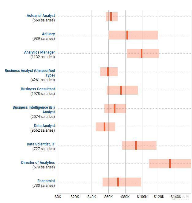 根据网站统计数据可以看到,数据分析师这个岗位年薪中位数也能达到54000美元,其他岗位年薪中位数都高于54000美元,分析总监年薪中位数高达13万美元,可以算得上一份高薪职业了。