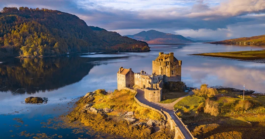 02 苏格兰最浪漫的古堡 Eilean Donan Castle,有着最绚丽的日落。远远望去仿佛扎根于湖泊中间的一个小岛上,一石桥跨湖连接城堡与陆地,安详的湖水和古老的城堡构成一幅如诗如画的美景。