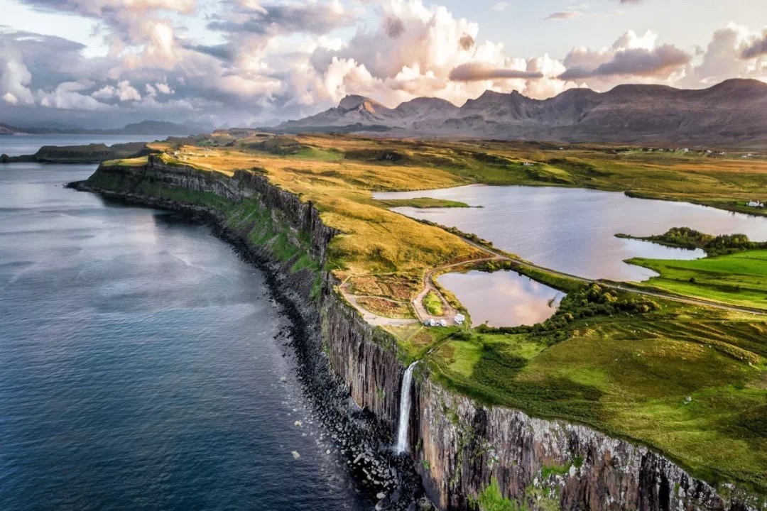 06 美丽的Isle of Skye上著名的 Kilt Rock 和旁边奔流的瀑布,(有个可爱的花名,苏格兰裙摆岩石)Kilt Rock上的格子是大自然编织了1.6亿年才得到的成果。近处一道飞流入海的瀑布是配这条格裙的围巾。