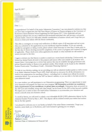 录取结果 : 罗切斯特大学( match 2018年金融专业排名 #13 )