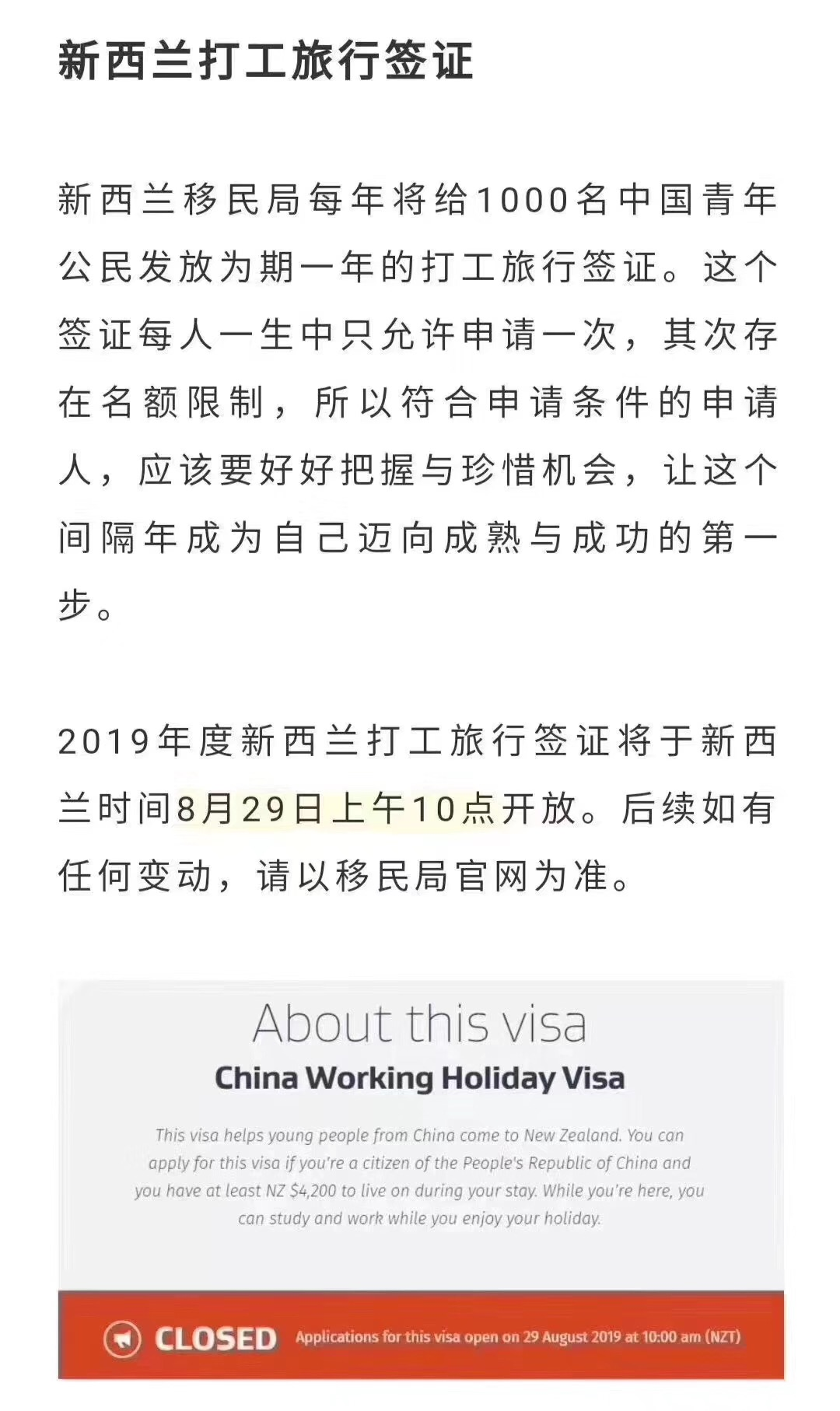 移民局每年都会允许1000名中国青年公民前来新西兰打工度假,往往每年的名额一开始发放,就会在短时间内被一抢而空。新西兰移民局公布的消息显示2019年最新一轮的名额开放时间在新西兰当地时间2019年8月29日上午十点准时开放~