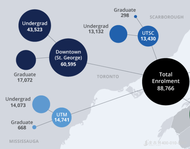 多伦多大学由三大校区组成:市中心的圣乔治校区( St. George Campus ,简称 UTSG ), 在校 学生 60595 名;密西沙加校区( Mississauga Campus ,简称 UTM ), 在校 学生 14, 073 名;士嘉堡校区( Scarborough Campus ,简称 UTSC ), 在校 学生 13, 430 名。