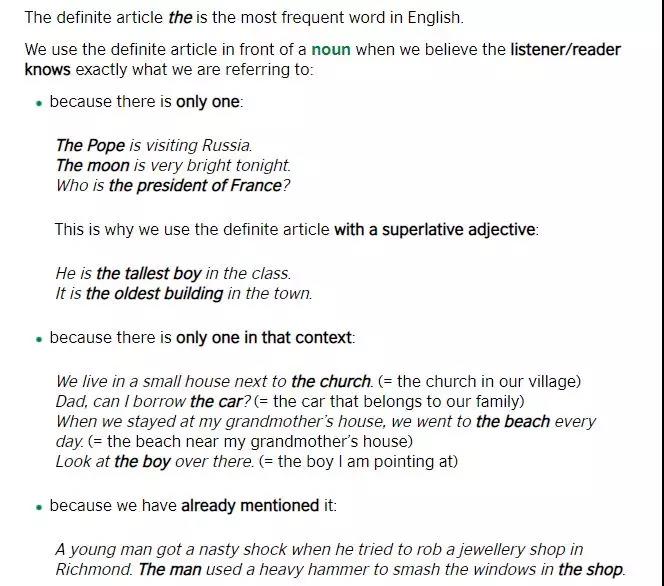 语法栏目将语法知识点分为简单和中等两个等级, 针对简单等级的知识点主要是冠词、名词的数以及介词,中间等级的知识点则是时态、情态动词以及被动语态等 。同时网站上还有一系列解释语法知识难点的文章,由语法专家Dave Willis撰写,这些文章深入浅出,非常值得一读。比如下面是作者对于定冠词the用法的说明,写得很清晰: