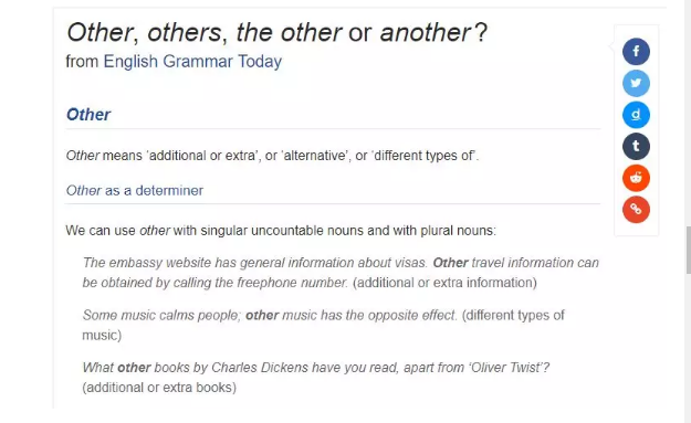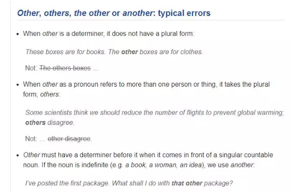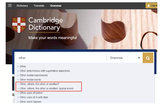 举个例子,other/the other/others/another 这几个词很多人经常搞混,它们之间有哪些区别呢? 你可以直接在网站上搜索上面这几个单词的任意一个,从搜索结果下拉框中可以看到对应语法词条的入口。
