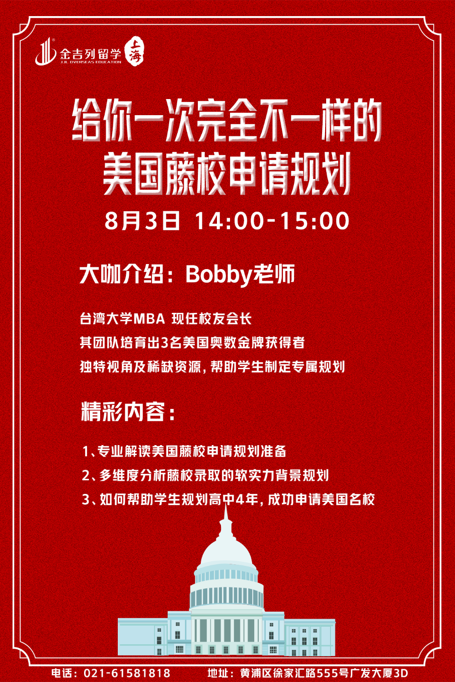 本周末,在上海金吉列,Bobby老师带你解锁美国本科申请新思路。