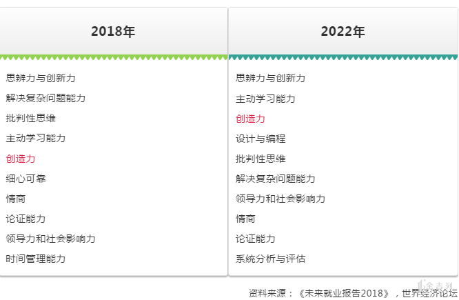 根据2018年世界经济论坛《未来职业报告》, 预测2022年人类最关键的十大能力,"创造力"从2018年的第5位一跃而至2022年前三甲 ,仅次于“思辨力与创新力”及“有学习方法并主动学习”亟需职业技能。