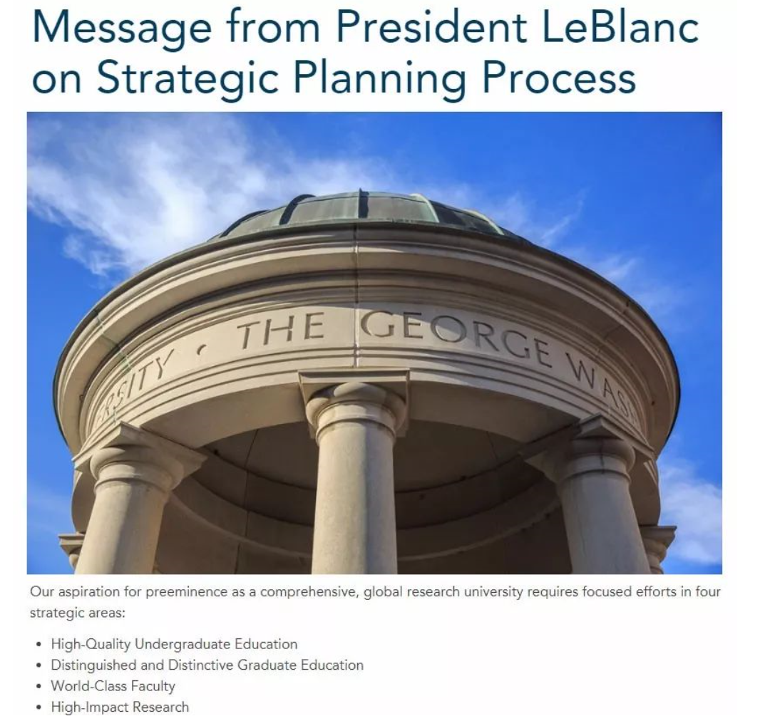 关于缩减规模,目前乔治华盛顿大学提出了一个五年战略计划的初步框架,细节还在讨论中。校长 LeBlanc 公开信大致提出四项发展领域:高质量的本科教育;独特杰出的研究生教育;世界一流的教师;高影响力的研究。