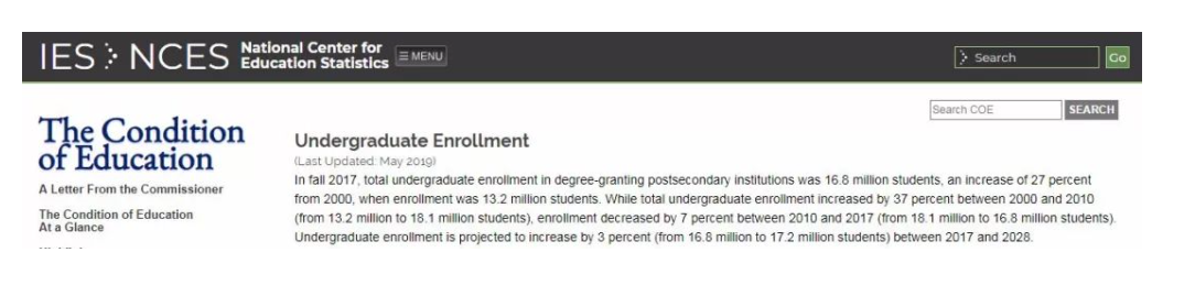 根据美国国家教育中心统计,2010年-2017年,美国大学生入学率下降了 7%,入学率的大幅下降导致大学为了招生采取向海外拓展的办法,比如雇用外部公司招收海外学生填补本土的空白。