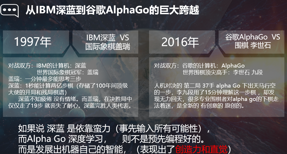 应用举例:深度学习 (谷歌AlphaGo战胜围棋世界冠军李世石)、 计算机视觉 (美颜拍照、人脸识别)、 语音识别 (微信语音消息转文字、讯飞语音输入法、营销 AI 机器人)、 虚拟个人助理 (苹果Siri、小米小爱同学)、 智能机器人 (扫地机器人、格力工业机器人)、 引擎推荐 (淘宝、京东等购物习惯推荐)、 无人驾驶 (特斯拉、滴滴、 Uber )等等 。