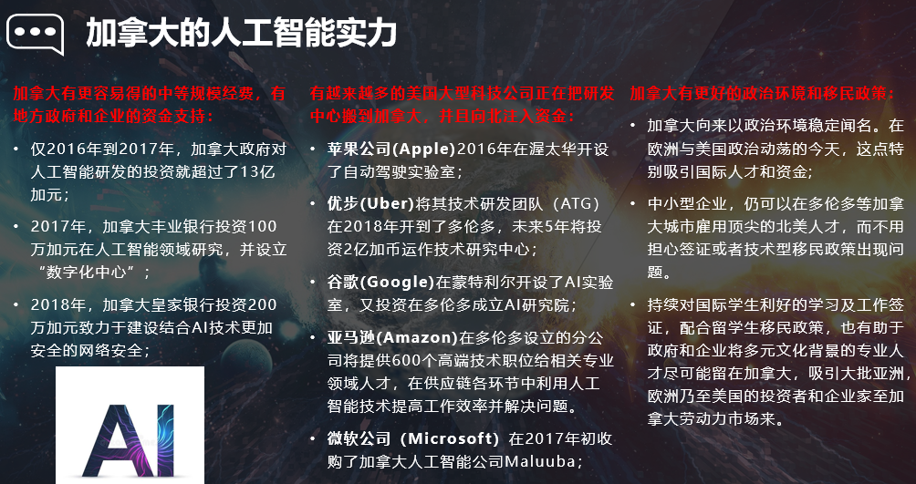 京东无人仓储物流的投放使用、阿里巴巴的智能点餐系统的问世,不少专业人士表示感慨,人工智能时代即将来临。AI与智能机器人STEM专业将会成为未来时代的主流,如果各位想留学的学生还在为专业纠结的话,不妨跟随老师了解下加拿大的人工智能:
