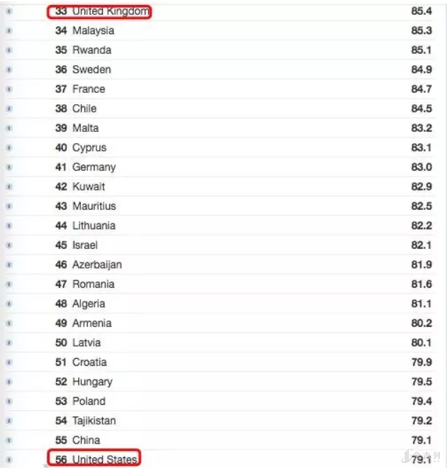 澳洲排在了16位 ,远超了排在33名的英国,和56名的美国,而中国的安全性排名则在美国之上。