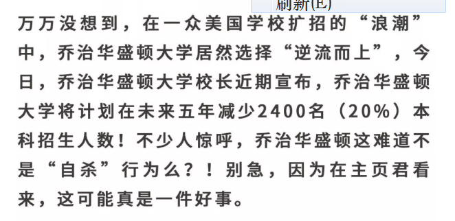 很多学生去美国是为了感受精英教育,而不是职业培训,精英教育本身就不该是盲目扩招的产物,相信乔治华盛顿大学的这一举动可以给不少学校以启发,也希望各大学可以更加关注学生个体的培养,对得起我们年年攀升的学费!