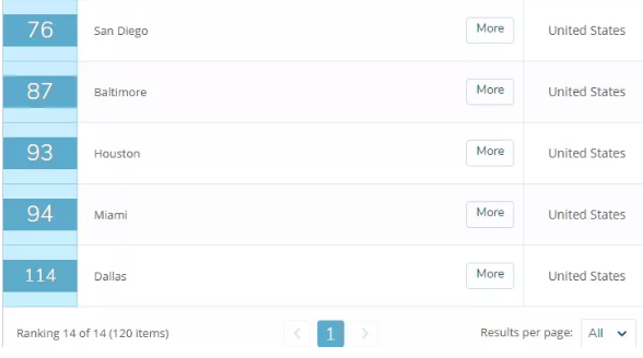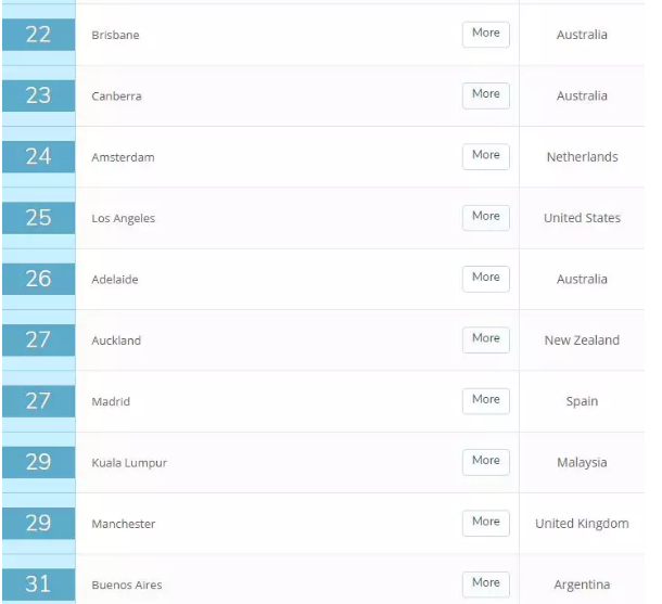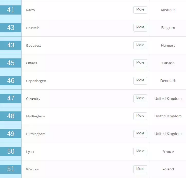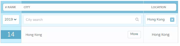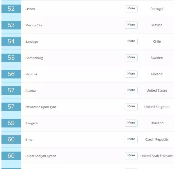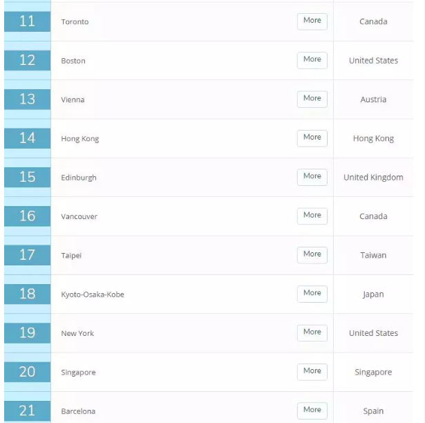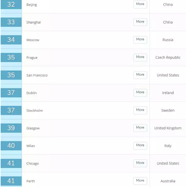 此次中国共有7个城市入榜,其中大陆有4个,分别是北京(32)、上海(33)、南京(99)、武汉(105);台湾地区有2个城市,分别是台北(17)、新竹(68),以及香港(14)。排名最高的城市是香港。