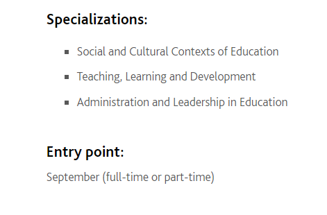 教育硕士(ME) 课程旨在让学生全面了解影响教育的理论观点,并让他们对研究有基本的了解。学生可以申请任何一个专业领域。每个专业领域都需要核心课程和选修课程。所需课程的数量根据专业领域和通过该计划选择的途径而有所不同。请注意,该计划不会导致安大略省认证教师的指定,这是在安大略省的公立学校教授的。九月入学,全日制或兼职都可。(16个月的论文型学位有资金资助,3个学期的课程型没有资金资助,论文衔接课程型 MRp 学时为6个学期,全日制学生允许3年内完成,兼职最长可以5年内完成)