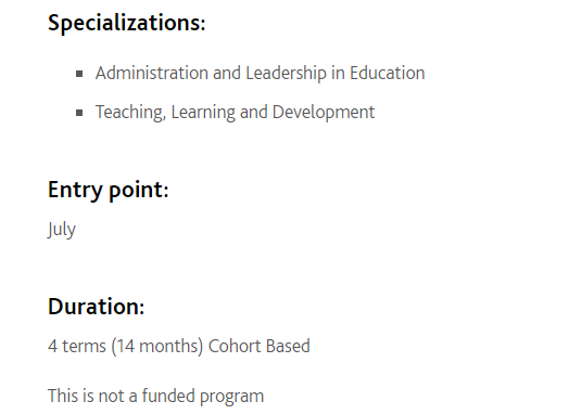 教育硕士国际学生计划(ME ISP) 是为国际学生设计的,并从强化英语语言学习计划开始,以协助过渡到研究生院。该课程的重点是教育的管理和领导,另一个侧重于教学,学习和发展,旨在为国际学生提供增强其学术背景的机会。他们还将更加了解加拿大在教育研究中取得学术探究技能的问题和挑战。ME ISP的11个半学分课程被组织成为为期14个月的强化课程。该计划不会导致安大略省认证教师的指定,这需要在安大略省的公立学校任教。七月入学。没有资金资助。