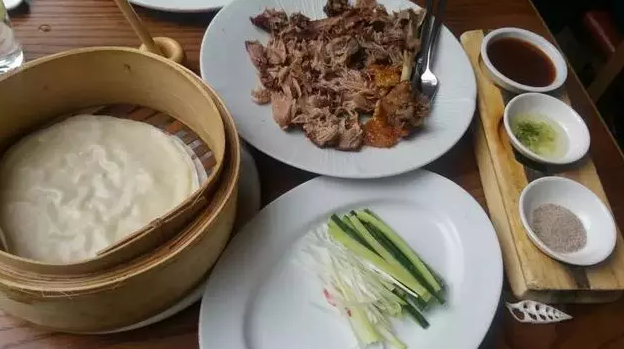 上图的烤鸭,看着像是北京和广东的融合,蘸的东西还包括了椒盐和酱汁,很是有趣。