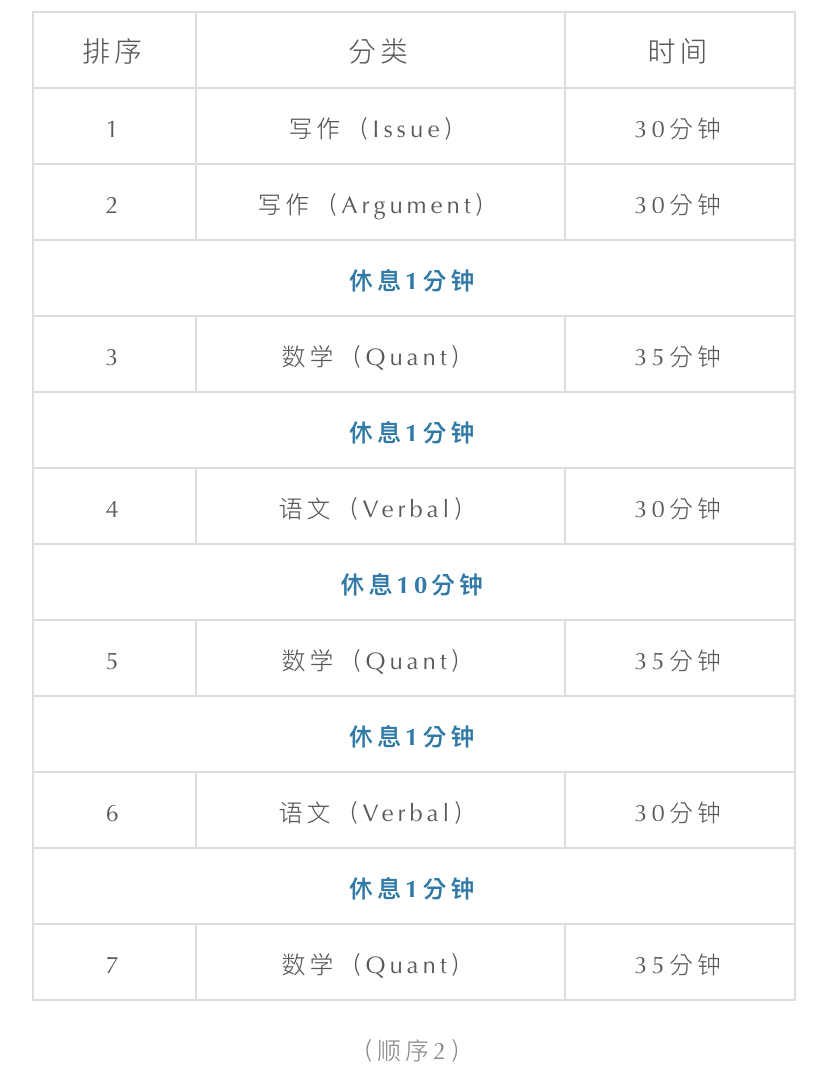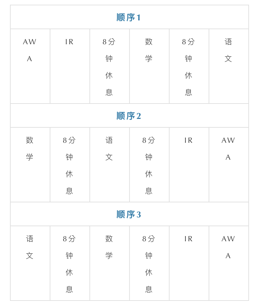 GMAT考试提供3种考试顺序,考生可以从3种顺序中任意选择一种进行考试。
