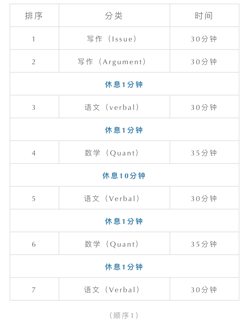 GRE考试顺序取决于加试题目是Verbal还是Quant,如果是Verbal则是下面顺序1,反之则是顺序2。