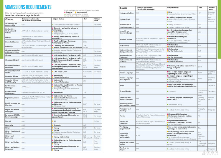 因为繁琐和十分有难度的笔试和面试,牛津大学给出的 offer 对 A-level 的要求并没有剑桥大学高,因为很大一部分人都在笔试和面试筛选过了。牛津本科对 A-level 的要求介于 AAA* 和 AAA ,而对于雅思的要求也是十分严格的。除了计算机科学,数学与统计,数学,数学与计算机这四门课程要求雅思 7.0 ,单项不低于 6.5 ,其余所有课程均要求雅思 7.5 ,单项不低于 7 。