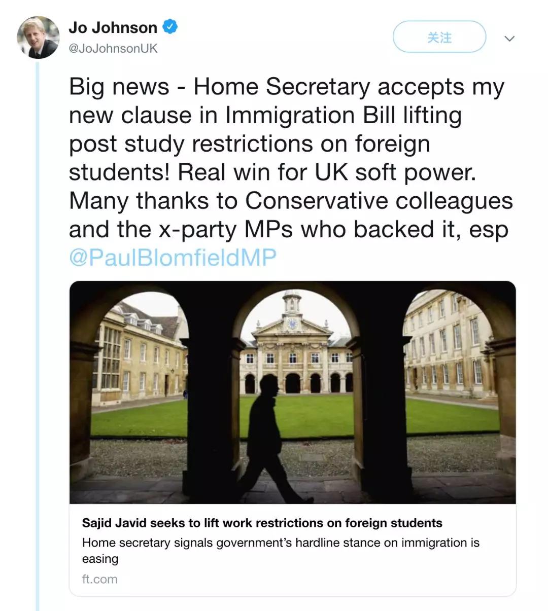 鲍里斯竞选团队的核心成员,也是他的亲弟弟Jo Johnson,随后也在twitter上转发了这则消息,表达了希望恢复PSW的立场,希望通过留住更多人才来增强英国的软实力。