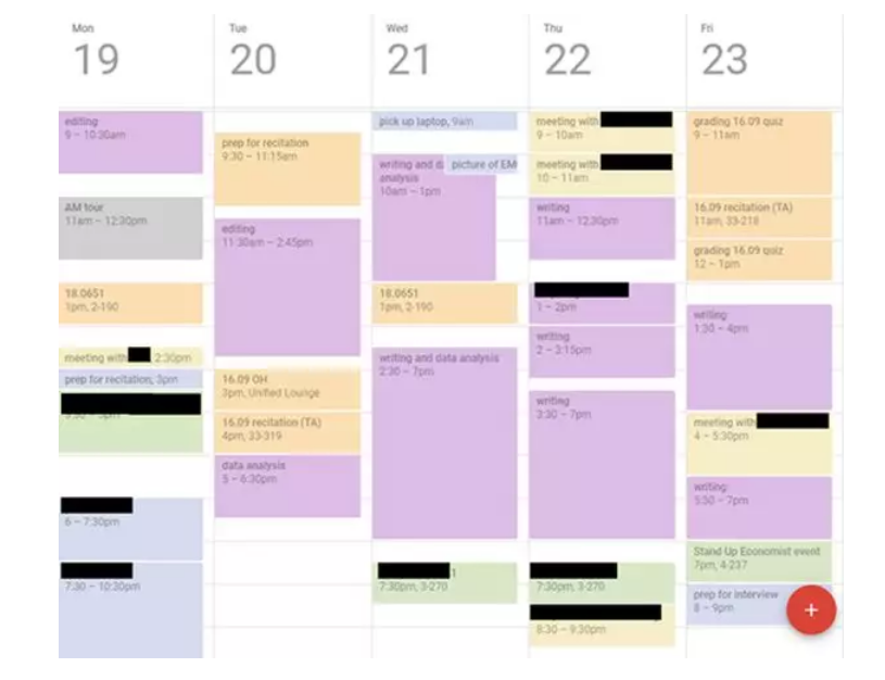 把自己做的事情都显示在日历上,可以很简单明确的看到花了多少时间在会议、学习、课堂作业上。有的周是大片的橙色带零星紫色,这意味着我一直在上课或做课堂作业,那这段时间在研究上就进展不大;大多数情况,我是希望能多挤些时间做研究,但到了期末,当然要所有时间集中在课堂上。