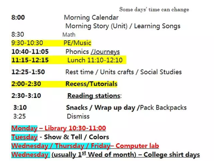 参考上图加拿大某公立中学的一周作息表,8点钟到校,8点30开始上第一节课,然后下午3点10分收拾书包,3点25分就放学。