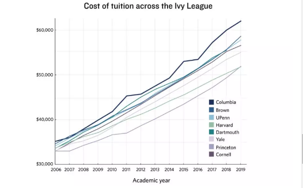 全美国的大学都在涨学费,更何况私立的藤校。通过这个学费趋势图,我们可以看出,哥伦比亚大学一路领先,始终是“最贵”藤校,2019-2020 学年更是以 $62,000 领跑。