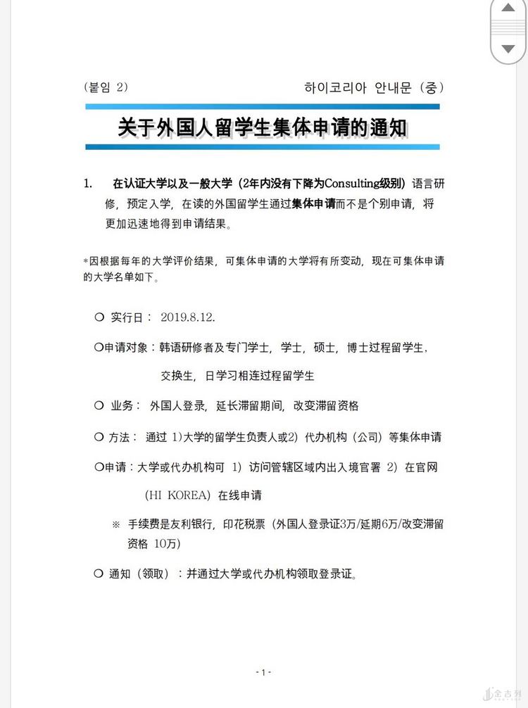 从 2019.8.12 起,在首尔出入境外国人厅(包括世宗路办事处)以及南部出入境事务所管辖区域内大学就读的(语言研修,留学)留学生可通过大学(留学生负责人)或代办机构申请延长滞留期间等业务。