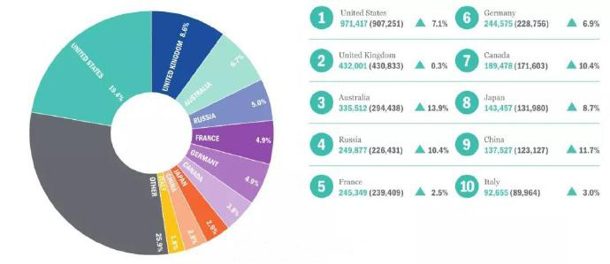 2017-18学年,留学英国人数最多的5个国家和地区是: