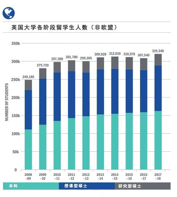 2017-18学年,全球共有超过45万留学生在英国高等教育机构学习,占英国学生总人数的19.6%。其中,14%的本科生和35.8%的研究生是留学生。